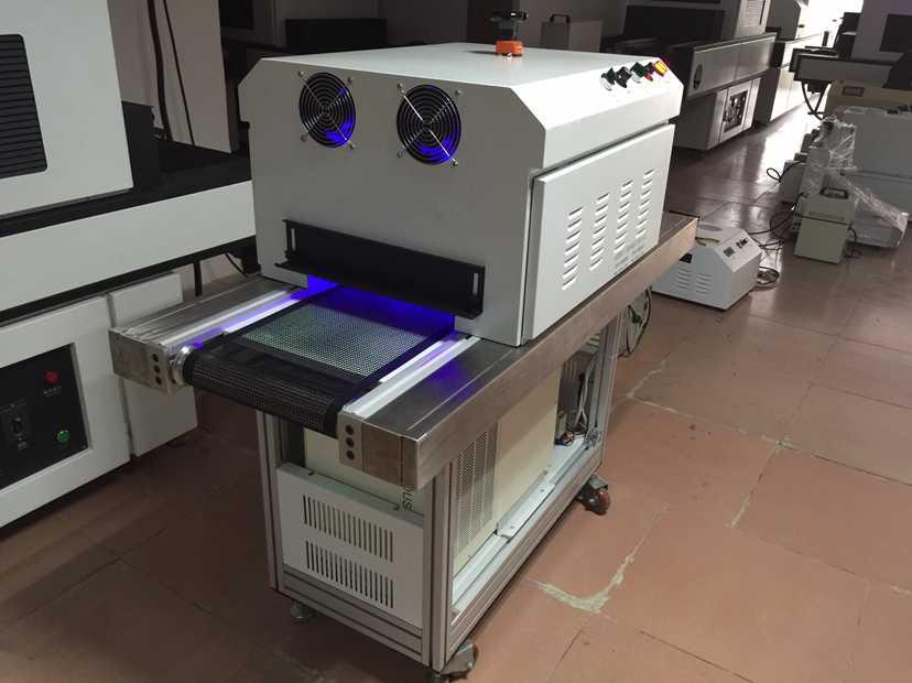 1)臺式uv機是利用UV光源來固化UV涂料的設備,如UV漆,UV油墨,UV膠等,與UV涂料里的光敏劑起化學反應,瞬間干燥固化。UV固化機的核心部件即UV燈管,峰值365nm,效果更佳的則是采用金屬鹵素燈,波長峰值380nm,用于難以固化,涂層較厚的UV油墨等。